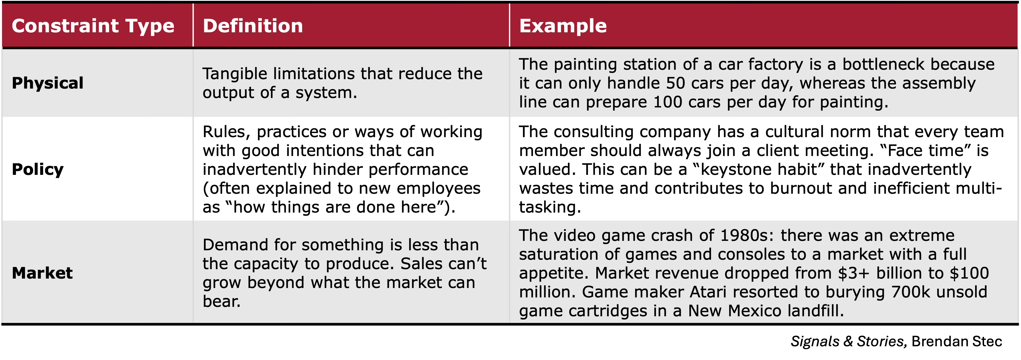 For a business, limiting factors are also often called “constraints”, from Eli Goldratt’s Theory of Constraints. Constraints are often physical, policy or market-related: