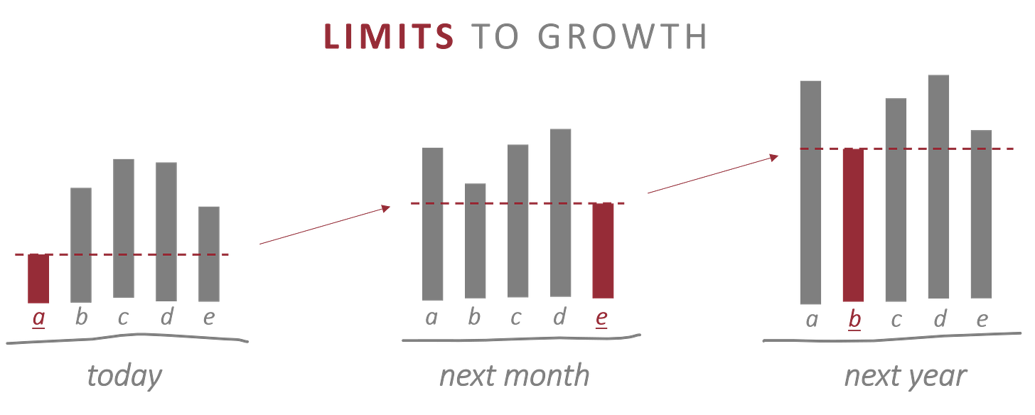 Limiting factors are common across many domains. The below examples are all from Donella Meadows’ neural-volume-expanding book Thinking in Systems: